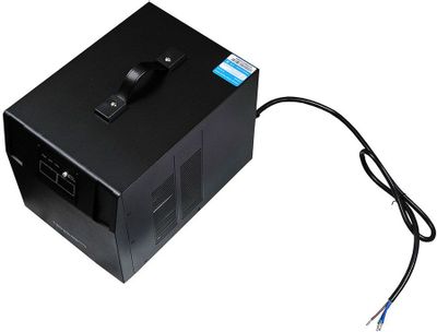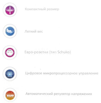 С ручкой для переноски.. на 3 кВт. Активное охлаждение. Доступный ценник. Обычные розетки. используется на даче.. в основном летом, свою задачу выполняет.. у нас там холодос и большая морозилка, всё это подключено к нему. Выравнивает. шумит немного