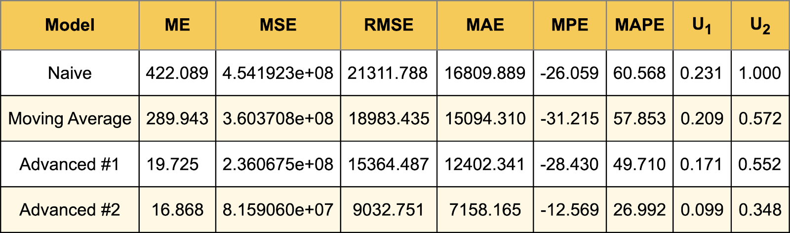 С другой стороны, «Advanced # 1» и методы скользящих средних подходят для грубых оценок. Вышеупомянутые выводы было бы невозможно сделать без рассмотрения альтернативной статистики, которая показывает, что никакая статистика оценки прогнозов не является избыточной, поскольку каждая из них имеет информацию, которую нужно сообщить.
