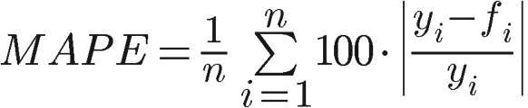 - Находится среднее арифметическое всех абсолютных процентных ошибок прогноза (абсолютные процентные ошибки суммируются и делятся на количество) — Mean Absolute Percent Error