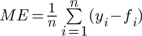 Это очень простая статистика. К сожалению, это предвзятость из-за компенсирующего эффекта положительных и отрицательных ошибок прогноза, которые могут скрыть неточность прогнозов. Из-за этого ME не очень полезен для оценки модели. Однако это очень легко понять даже неспециалисту (это не всегда является преимуществом из-за ограничений, описанных выше). ME может быстро представить симметрию распределения ошибок, что может быть полезно при оценке конкретной модели.
