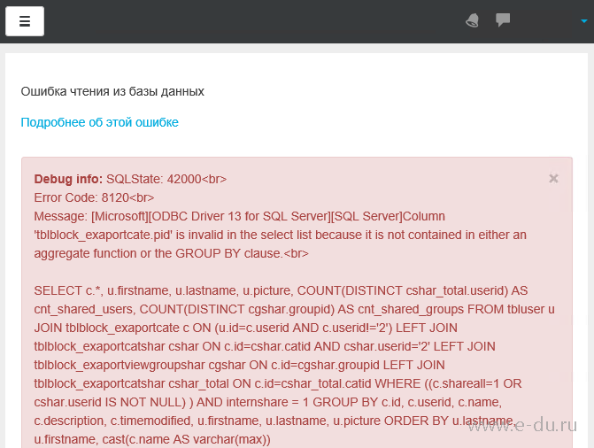 Нажатие на ссылку «Подробнее об этой ошибке» ведет на документацию на официальном сайте Moodle и не дает представления о конкретной причине произошедшего.