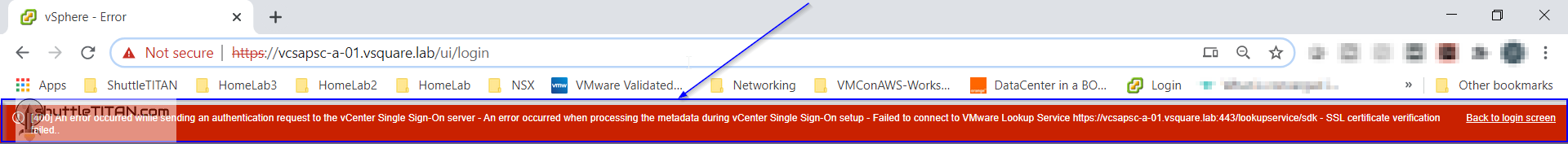 3. Jumping to the vCenter login page by using bookmark (URL) saved before – “[400] An error occurred while sending an authentication request to the vCenter Single Sign-On server – An error occurred when processing the metadata during vCenter Single Sign-On setup – Failed to connect to VMware Lookup Service https://:443/lookupservice/sdk – SSL certificate verification failed.”