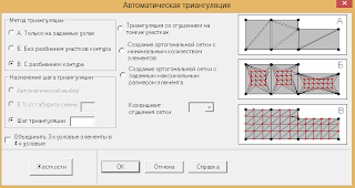 Схема — Генерация сетки произвольной формы. Здесь немного сложнее. Надо создать контур из любого количества точек, затем «Генерация треугольной сетки КЭ на плоскости». В появившемся меню выбираем необходимые нам параметры. У обоих есть свои плюсы и минусы. Идеально они работает компенсирую друг друга. Неважно каким из способов создавать сетке, главное результат.
