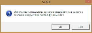 — Если задать грунт, а потом редактировать номера скважин, то усилия могут пойти прахом, грунты могу исчезнуть (как у меня) и придется заполнять заново.- Менее важно, но все же — при заполнении таблицы “грунты”, если вы забыл какой-то слой ввести в порядке очереди, для порядку, то вставить его в нужное место потом уже не получиться (как у меня).- Тоже пустяк — если грунт водонасыщенный, то надо бы задать его отдельным слоем, со своими параметрами, другого механизма нет.- И еще, уже подсказка — при заполнении скважин лучше давать отметки как есть в геологии, абсолютные, а то запутаться можно. — В окне «назначения коэффициентов упругого основания» лучше всего ограничивать число коэффициентов, хотя бы до 100, по двум причинам: читать результат будет легче и есть подозрение, что если ничего не трогать коэффициенты не присваиваются.- Очень важное наблюдение — если вы, вдруг, захотели изменить геометрию плиты и засунуть в существующую площадку, то вам не повезло. Конечно можно создать новую, но экспорта ни грунтов ни скважин я не нашел, то есть геологию придется вводить по новый. Если не хочется вводить по новый, а геометрию все-таки изменили, то путь решения проблемы следующий:- создаем новую площадку и выписываем от туда ее габариты (можно больше), чтобы в точности (можно не в точности) вставить их в существующую- есть кнопка удалить, воспользуемся ее и удалим существующий контур фундаментной плиты (возможно, что операция и лишняя, и достаточно выполнить пункт ниже)- этот пункт сложнее всего выполнить. из SCAD передаем в существующую площадку КРОСС новую геометрию (с измененным габаритом и уделенным контуром). теперь самое интересное. контур новой плиты отображен на площадке, а его очертание привязано к курсору мыши и перемещается по экрану вместе с ним. если нажать правую кнопку — результата не будет, все пропадет. остается один способ — левая кнопка. но(!) нужно попасть очертанием на контур (чтобы синие линии стали желтыми!), причем чуть-чуть промахнуться можно, но на сколько, только КРОСС знает. если что-то пойдет не так — он (КРОСС) остановит сообщением “ошибка импорта”Для выполнения итераций КРОСС — SCAD пришлось своим умом пройти тернистый не логичный путь, чтобы данные из SCAD все-таки учитывались в КРОСС (потрясающая программа отняла у меня два дня жизни). Разработанный мною алгоритм не совпадает с описанным в руководстве пользователя. Там (в руководстве) предлагают просто передать нагрузку в существующую площадку, затем удалить нагрузку равномерно распределенную, затем в меню “настройки” поставить галочку “нагрузки полученные из SCAD”. Схема преобразится, но если нажать расчет выскочит сообщение о нулевых осадках. Лечится созданием схемы только с геологией и отметкой подошвы (с нулевой нагрузкой на плиту). Вставляя в эту схему и щелкая “нагрузки полученные из SCAD” действительно все работает.Шаг 3. Расчет средствами SCAD Как бы хорош не был КРОСС, возможности в этом направлении у SCAD еще хуже. Одно то чувство при работе с КРОСС — серьезная программа, дружественный интерфейс, почти все функции работают и почти все понятно. Когда делаешь то же самое в SCAD такие чувства не возникают. Возникает одно — а стоит ли делать это в SCAD? Я проверил — ответ между строк. Во такое диалоговое окно, после того как мы прошлись по вкладке «назначения» — «назначе