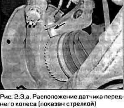3. В принципе, работа АБС очень проста: колесные датчики следят за частотой вращения колес и передают эту информацию в блок управления (рис. 2.3,а,б). Блок управления постоянно сравнивает сигналы этих датчиков. Пока сигналы не отличаются друг от друга, система остается пассивной. Однако если одно из колес замедляется, сигнал датчике этого колеса начинает отличаться от сигналов других датчиков. Так блок управления «узнает» о блокировке одного из колес автомобиля. При этом блок управления посылает сигнал на гидравлический исполнительный механизм, который снижает давление тормозной жидкости в колесном цилиндре заблокированного колеса. Как только колесо разблокируется и его частота вращения начинает совпадать с частотой вращения остальных колес, сигнал от датчика этого колесе также начинает совпадать с сигналами датчиков остальных колес. В этот момент АБС снова отключается.