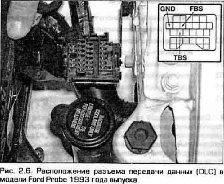 6. В моделях, выпущенных с 1993 по 1997 г., доступ к системе самодиагностики блока управления АБС осуществляется следующим образом. В разъеме передачи данных перемкните клеммы FBS и GND. Кроме того, подсоедините вольтметр к клеммам TBS и корпусу автомобиля (к любой точке заземления) (рис. 2.6). Поверните ключ зажигания в положение ON (но не запускайте двигатель) и следите за колебаниями стрелки вольтметре. Для этой цели Вам потребуется вольтметр стрелочного типа. Убедитесь в том, что напряжение аккумулятора не менее 11 В. рычаг переключения передач установлен в нейтральное положение, все потребители электроэнергии выключены, дроссельная заслонка закрыта, а двигатель прогрет до рабочей температуры.