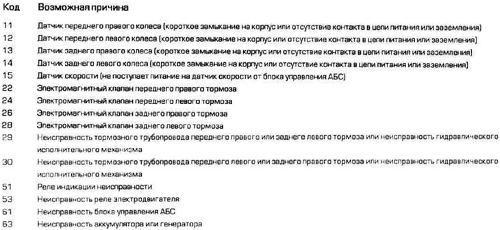 8. Ниже приведена расшифровка кодов неисправностей АБС, встречающихся наиболее часто. Устранение неисправностей должно производиться у дилера или на специализированной станции обслуживания.