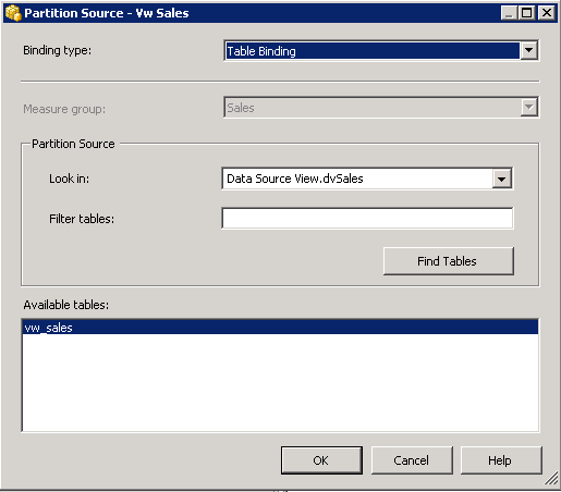 Здесь видно две группы мер Sales и Sales 1 и список их партиций. Для того, что бы разбить на партиции группу мер Sales, необходимо сначала изменить текущую партицию. Разбивать на партиции будем по дате продажи. Для этого в колонке Source для партиции жмем кнопку, которая появляется при получении этим полем фокуса ввода. Появиться окно:
