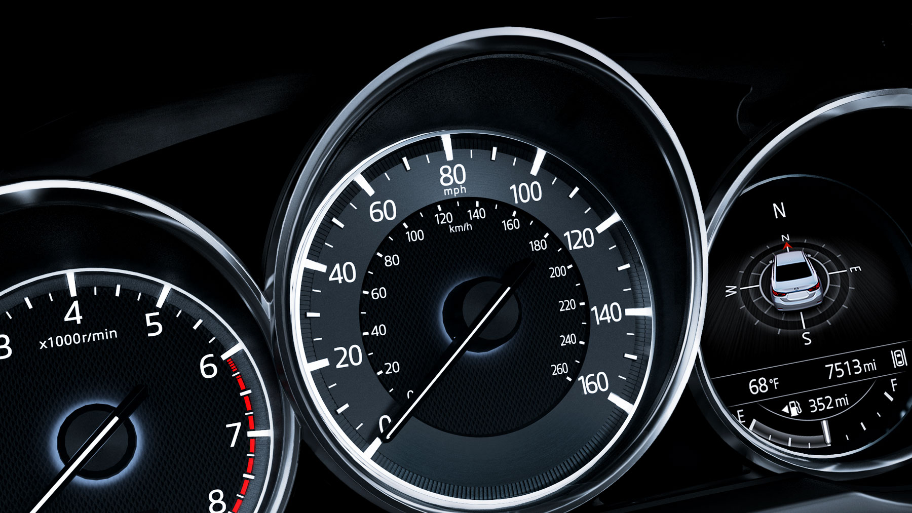 15 – Спидометр. Показывает скорость движения автомобиля в км/ч. Цена деления 5 км/ч. Mazda 6 Европа имеет максимум 260 км/ч, Mazda 6 США — основной циферблат до 160 м/ч, дополнитльный до 260 км/ч, Mazda Atenza Япония/Ю.Корея максимальная скорость 180 км/ч, Mazda 6 Южная Америка — основной циферблат до 260 км/ч, дополнительный до 160 м/ч.