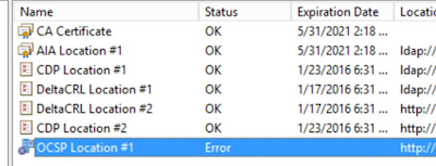 I am building a Single Tier PKI Hierarchy Deployment following the Step by Step Guide — Single Tier PKI Hierarchy Deployment guide. Everything is showing up «OK» except OCSP Location.<o:p></o:p>