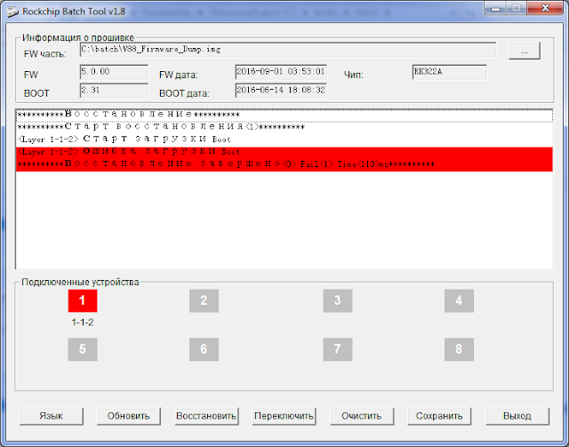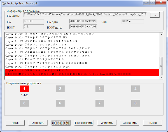 Запустите Rockchip Batch Tool и нажмите на “…” для выбора файла прошивки. Если вы сделали все правильно и драйвера RK установленны на вашем компьютере, вы увидите что один из индикаторов стал зеленым.