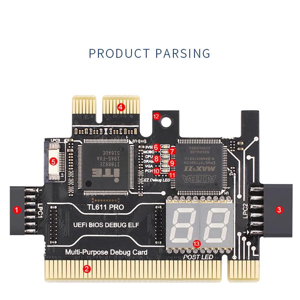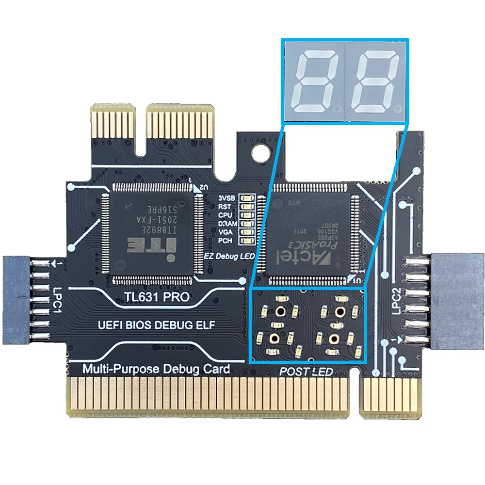 TL611 PRO:Это мощная многоцелевая отладочная карта, пара кодов ошибок, матричный дисплей шестнадцатеричный, этот TL611 может найти проблему вашей системы, за несколько секунд, избавьте компьютер от неприятностей и попытайтесь выяснить длительный процесс, вызванный сбоем системы. Решение соответствует спецификации шины PCI PCIE LPC и поддерживает различные новые и старые Материнские платы с чипсетом!