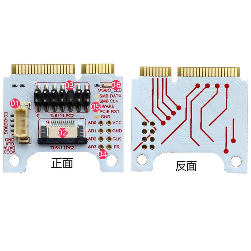 01.EC-DEBUG подключен к материнской плате EC02. Разъем FPC подключается к диагностической карте LPC303. Диагностическая карта для подключения контактного разъема LPC104. LPC Летающая линия05. Точка тестирования сигнала06. Индикатор материнской платы MOBO, проверьте правильность материнской платыВнимание:Подключите контактный разъем и разъем FPC, чтобы разумно подключить диагностическую карту. В то же время подключение диагностической карты приведет к неточному коду работы сигнального буфера.